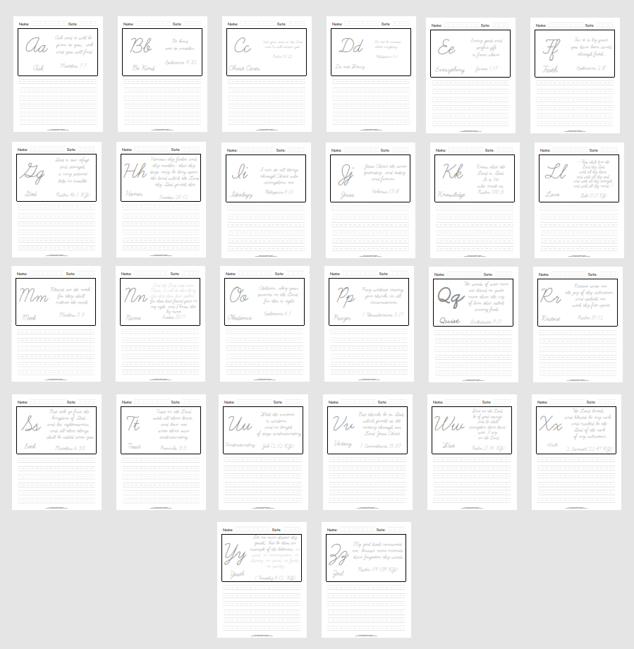 Children can read the verse, and copy it accordingly onto these lined sheets. We provide the carefully and prayerfully chosen scripture for children to trace in cursive.