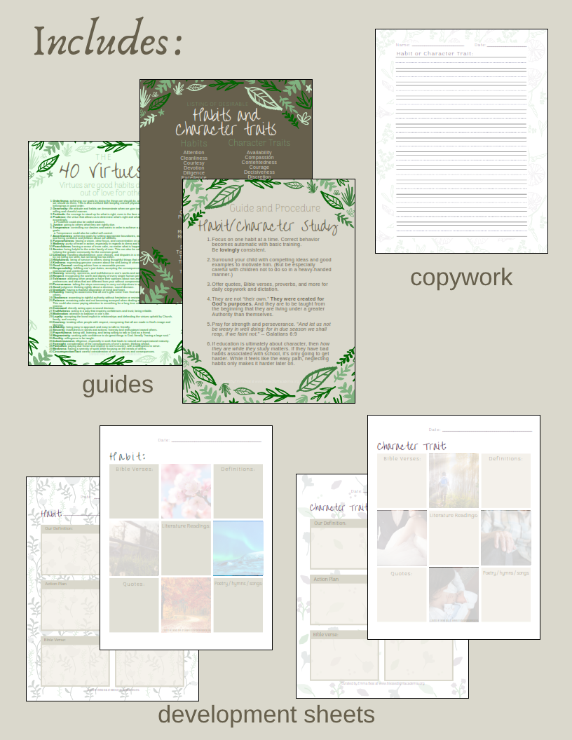 The first 3 pages have a guide and procedure, a list of Habits and Character Traits to study, and a short list of the 40 Virtues with some Biblical exlpanations.